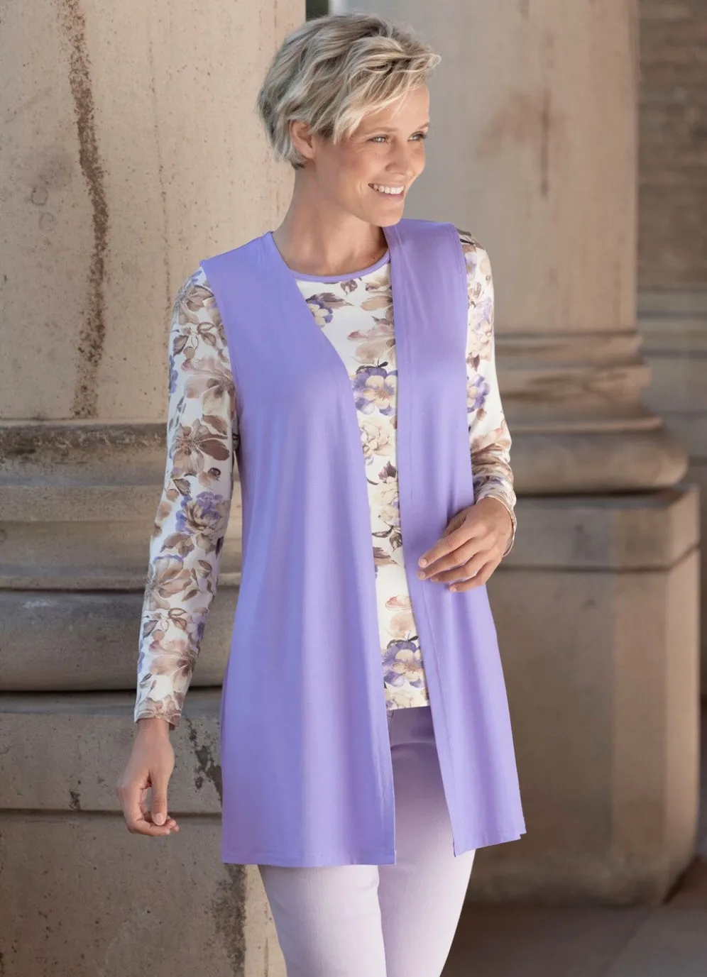 Wunderschönes 2-teiliges Set, bestehend aus einer lilafarbenen Weste in legerer, verschlussloser Form;