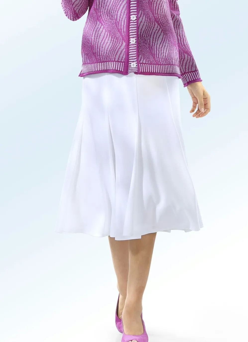 Exzellenter, weich fließender langer 8-Bahnenrock in komfortabler Schlupfform, glatt anliegend dank des innenliegenden, unsichtbaren Rundum-Dehnbundes, mit glockig schwingendem Saumabschluss. Länge ab Taille ca. 72 cm, bei K-Gr. ca. 68 cm.