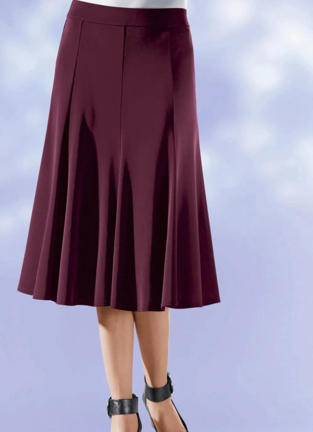 Exzellenter, weich fließender langer 8-Bahnenrock in komfortabler Schlupfform, glatt anliegend dank des innenliegenden, unsichtbaren Rundum-Dehnbundes, mit glockig schwingendem Saumabschluss. Länge ab Taille ca. 72 cm, bei K-Gr. ca. 68 cm.