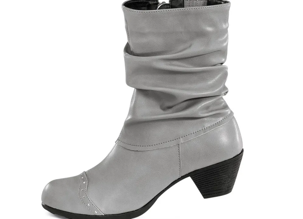 Stiefeletten aus schattiert geprägtem Synthetikmaterial mit Raffung: Innenreißverschluss, seitlicher Gummizug, Warmfutter und warme Decksohle aus 100% Polyacryl, leichte TR-Profilsohle sowie 45 mm Absatz. Schafthöhe ca. 20 cm