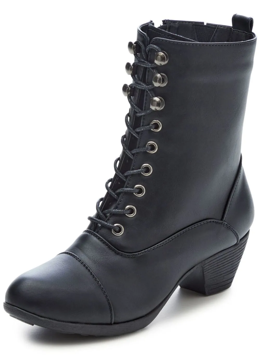 Stiefeletten aus Synthetikmaterial, mit Schnürung, Innenreißverschluss und seitlichem Gummizug: Warmfutter und warme Decksohle aus 100% Polyester, leichte TR-Profilsohle sowie 45 mm Absatz. Schafthöhe ca. 18 cm