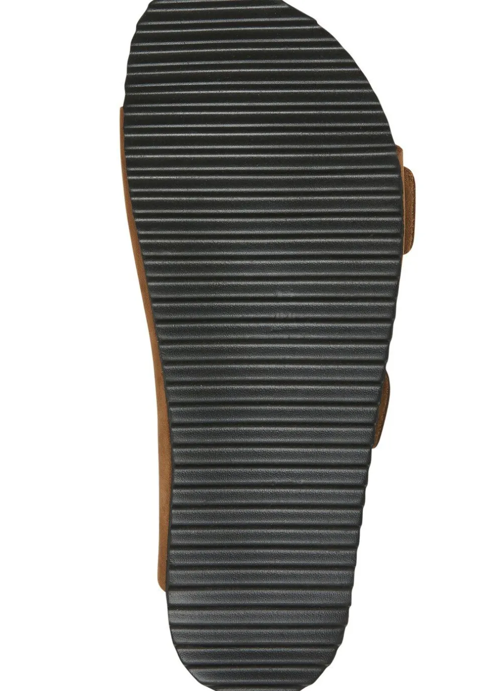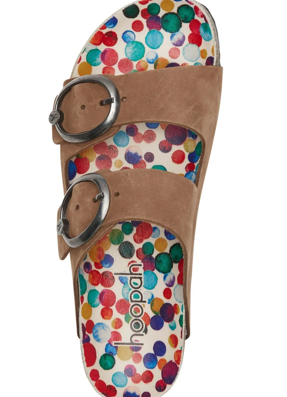 Angesagte Pantolette aus weichem Nubukleder, mit zwei verstellbaren Schnallen: bunt bedrucktes Lederfußbett, leichte EVA-Profilsohle sowie 10 mm Keilabsatz