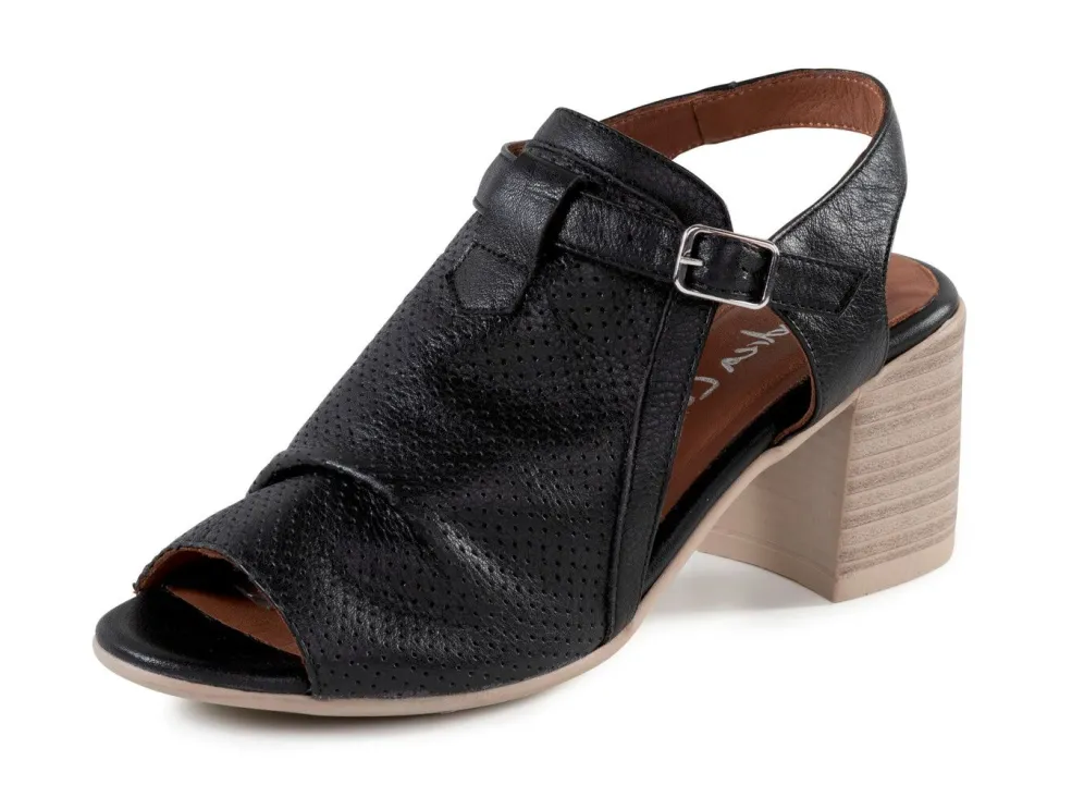 Aktuelle Sandalette aus weichem Nappaleder mit Zier-Perforation: verstellbare Schließe mit verdecktem Gummizug, Lederfutter, Lederdecksohle, TR-Riffelsohle sowie 55 mm Blockabsatz