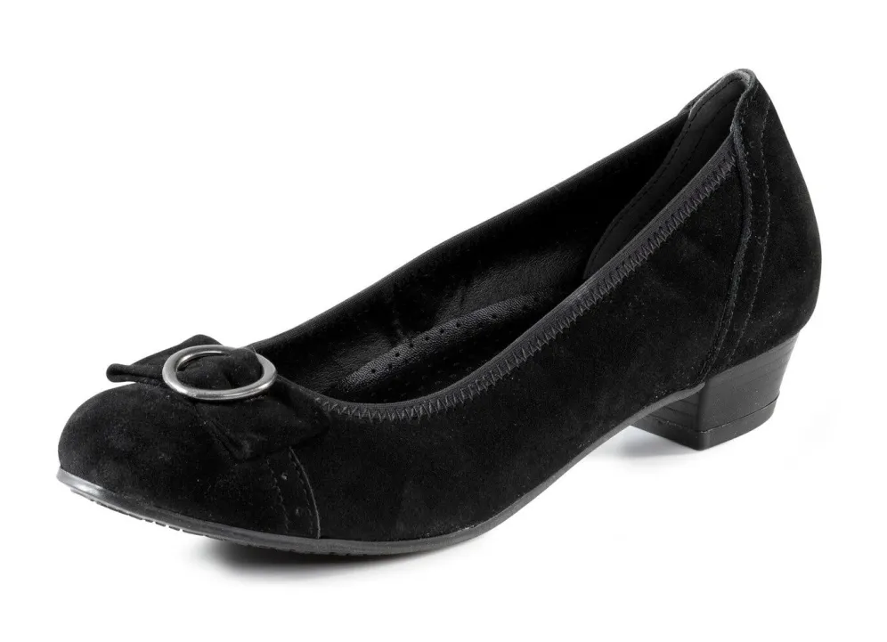 Schicke Pumps aus weichem Veloursleder, mit Rundumgummizug und Zierschleife: Futter, gepolsterte Decksohle, TR-Riffelsohle sowie 30 mm Absatz