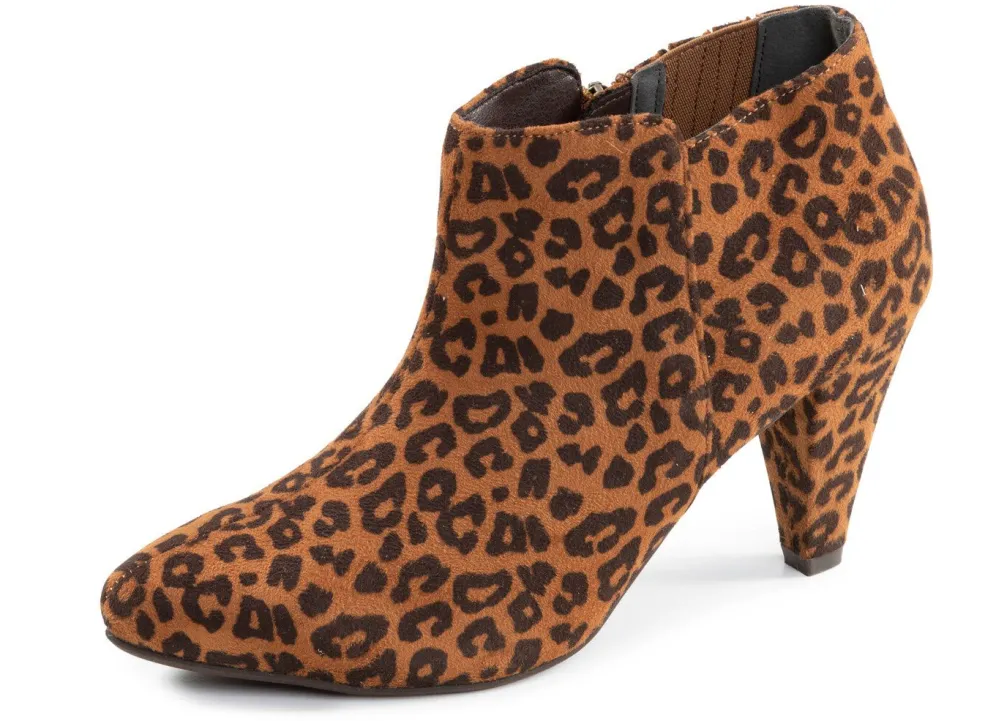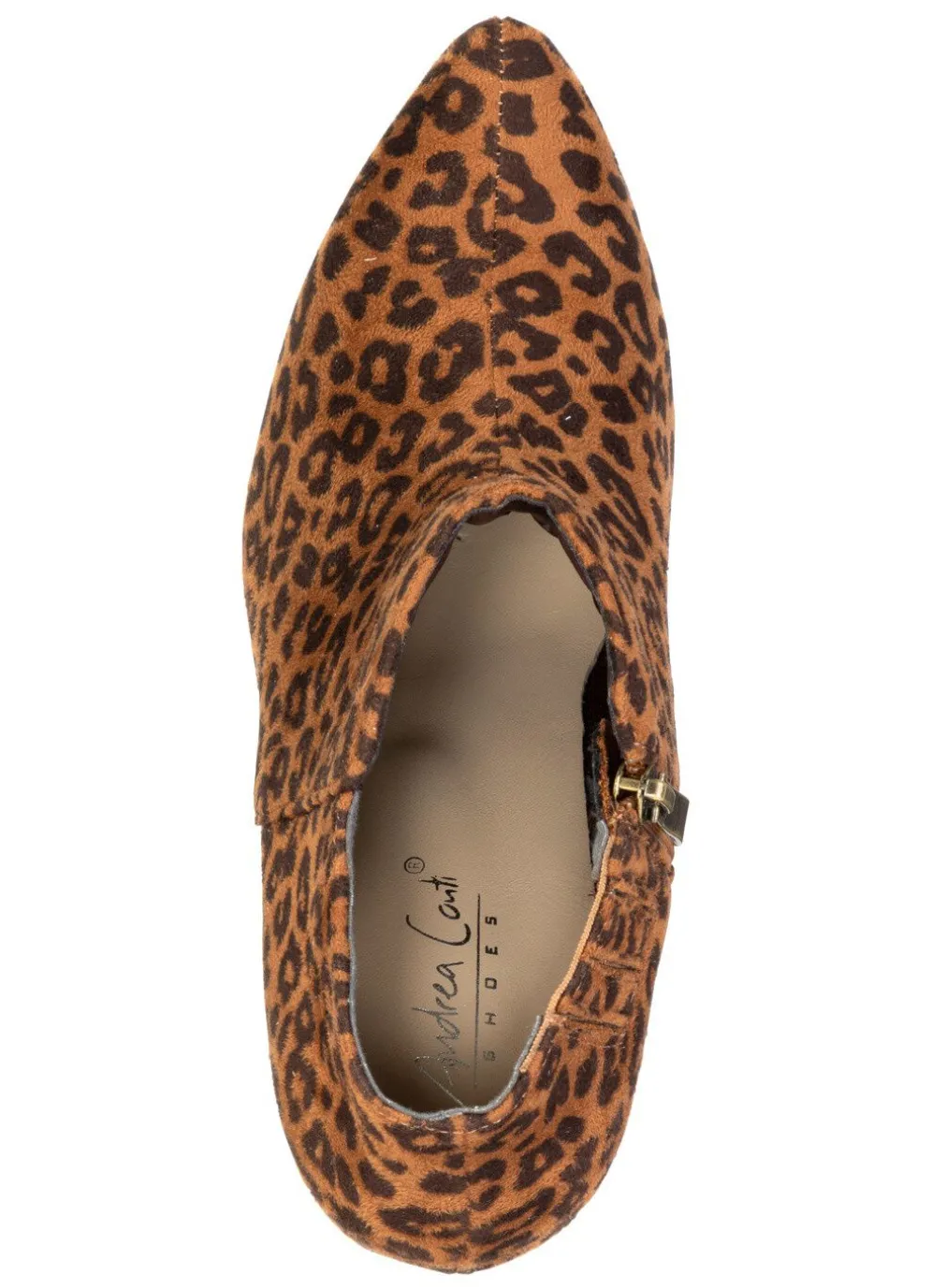 Stylische Stiefeletten aus Synthetik, in Braun-Schwarz aus bedrucktem Veloursmaterial: Innenreißverschluss, verdeckter Gummizug, Textilfutter, gepolsterte Lederdecksohle, Elastomeresohle sowie bezogener 75 mm Absatz. Schafthöhe ca. 8 cm