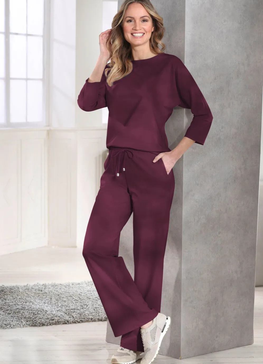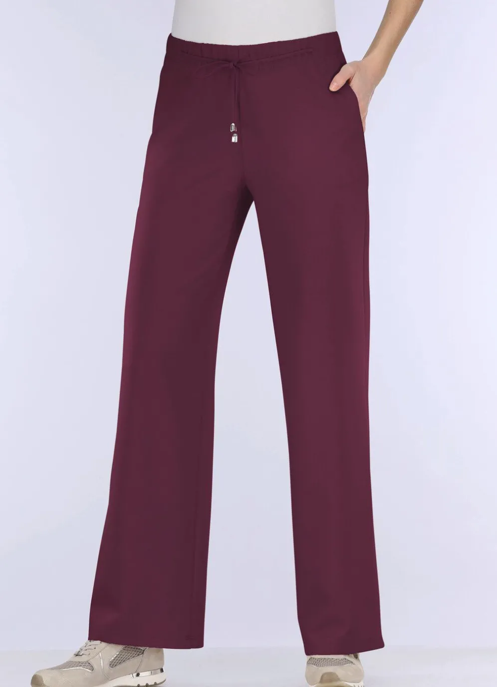 Angesagte Hose in modischer Weite und bequemer Schlupfform, mit Dehnbund rundum sowie Zierbindeband vorne am Bund und Seitentaschen. Innenbeinlänge ca. 78 cm, Fußweite ab 54 cm.