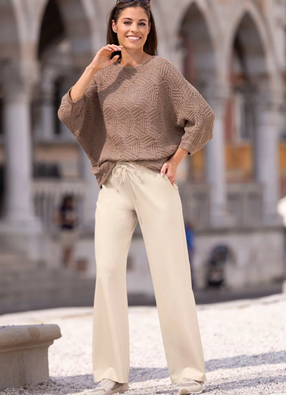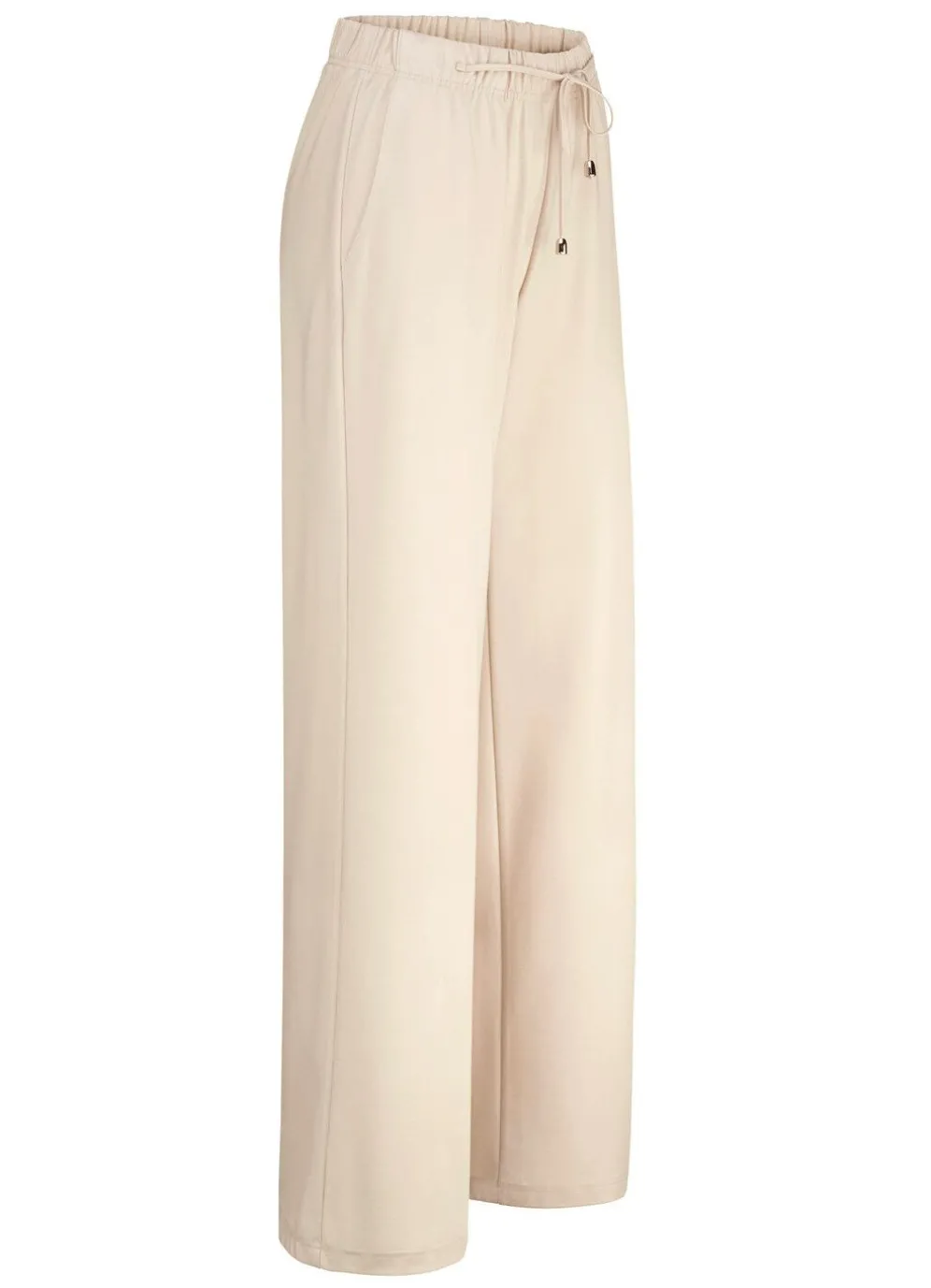 Angesagte Hose in modischer Weite und bequemer Schlupfform, mit Dehnbund rundum sowie Zierbindeband vorne am Bund und Seitentaschen. Innenbeinlänge ca. 78 cm, Fußweite ab 54 cm.