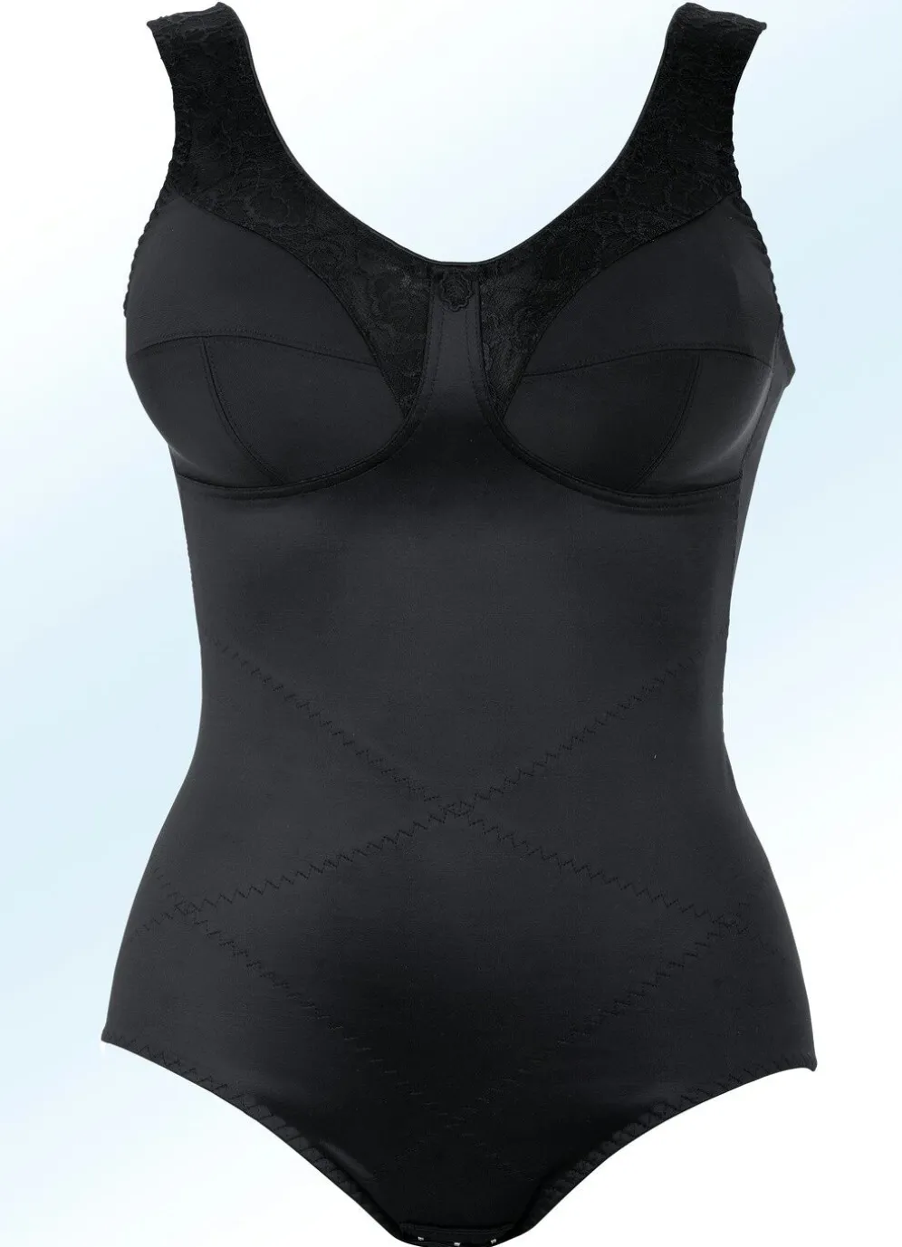 „Anita“-Entlastungs-Hosenkorselett: Einsätze aus Textronic-Spitze vorne, breites Verstärkungsband vom Rücken bis ins Vorderteil, im Schulterbereich verstärkte, verstellbare Stretchträger sowie Hakenverschluss und Baumwolleinlage im Schritt.