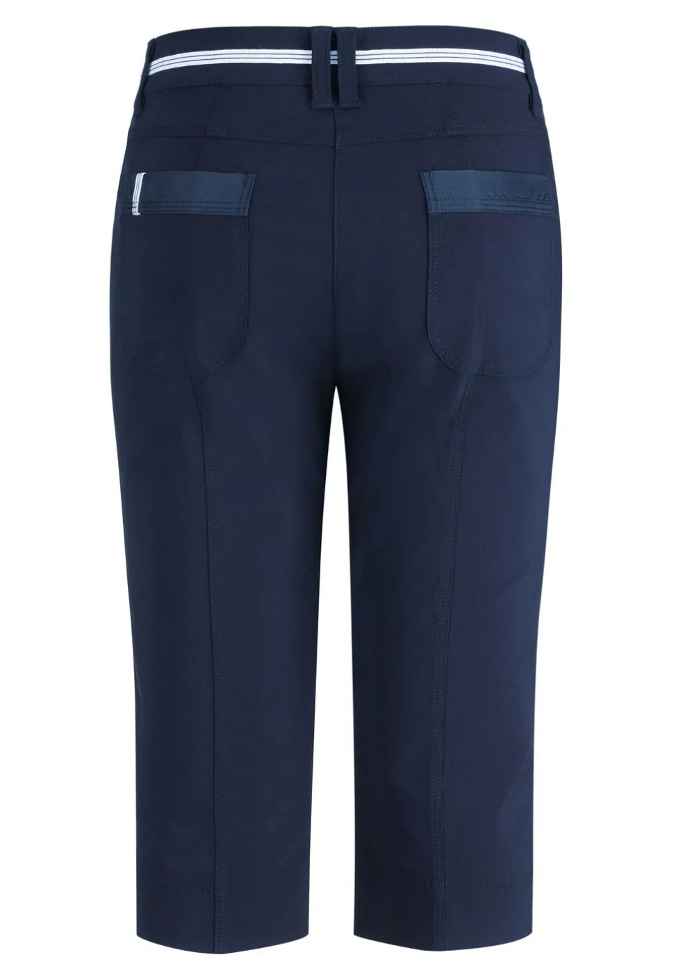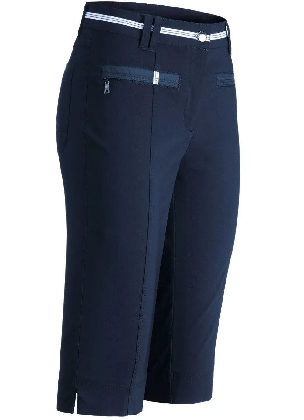 Unsere aufwendig gearbeitete Bermudas für die Freizeit: elastischer Bund mit kontrastfarbenem Zierband, Knopf- und Reißverschluss, paspelierte Seitentaschen mit Reißverschluss, Gesäßtaschen, Passe im Rückteil sowie figurgünstige, abgesteppte Teilungsnähte im Vorder- und Rückteil. Innenbeinlänge ca. 41 cm