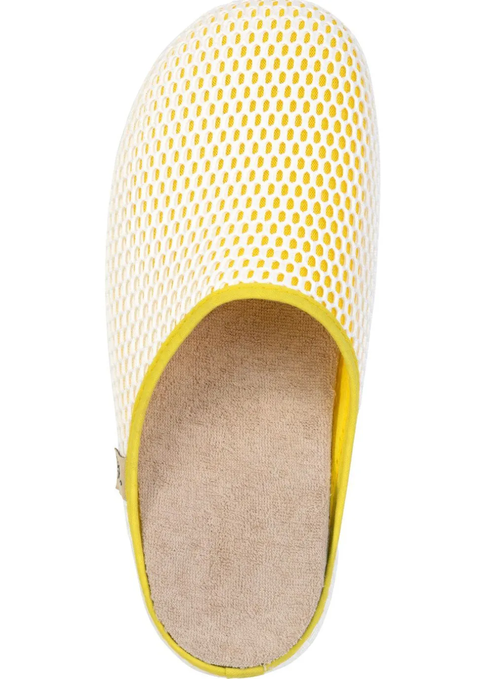 Hausschuhe aus farbig unterlegtem, weißem Mesh-Material mit grober Netz-Struktur: Weite H, herausnehmbares Textilfußbett, leichte Gummi-Laufsohle sowie 10 mm Keilabsatz