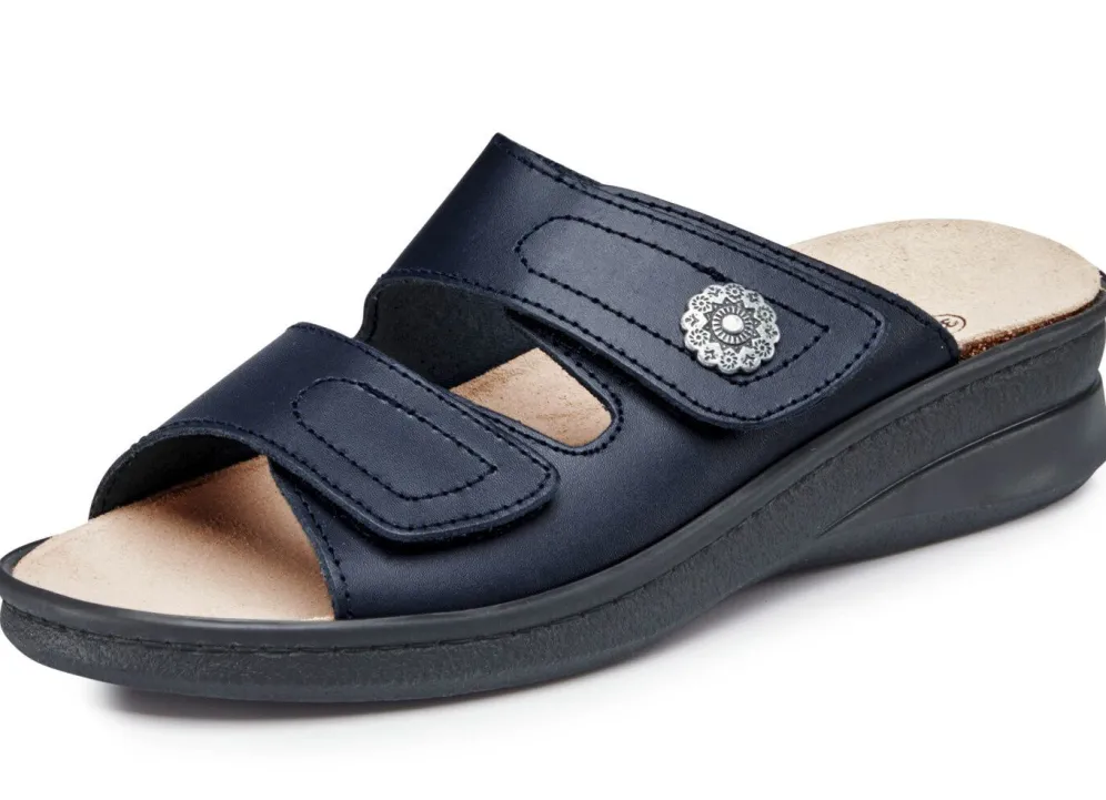 Pantoletten aus Rind-Nappaleder: zwei verstellbare Klettspangen, herausnehmbares Kork-Naturkautschuk-Lederfußbett, leichte TR-Riffelsohle sowie 35 mm Keilabsatz