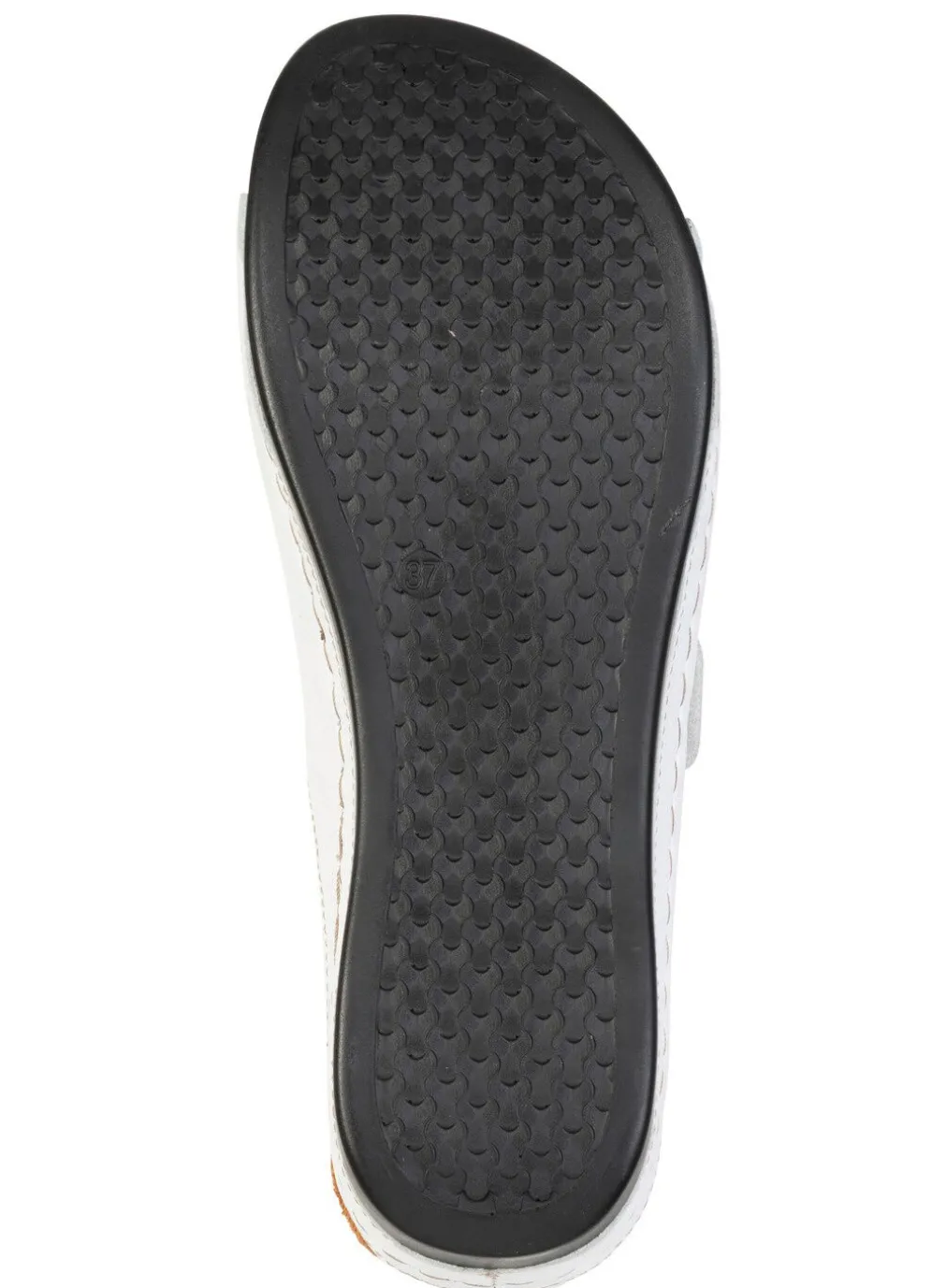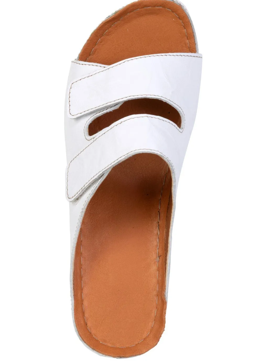 Pantoletten aus Nappaleder mit dezent schattierter Knitter-Struktur: Weite G, zwei verstellbare Klettspangen, Futter, gepolstertes Lederfußbett, leichte PU-Laufsohle sowie 30 mm Keilabsatz