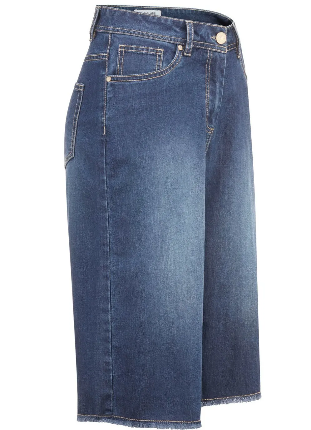Flotte, sportive Bermudas in 5-Pocket-Form: elastischer Formbund, Gürtelschlaufen, Knopf- und Reißverschluss, Jeanssattel sowie trendiger Fransensaum an den Beinabschlüssen. Innenbeinlänge ca. 35 cm.