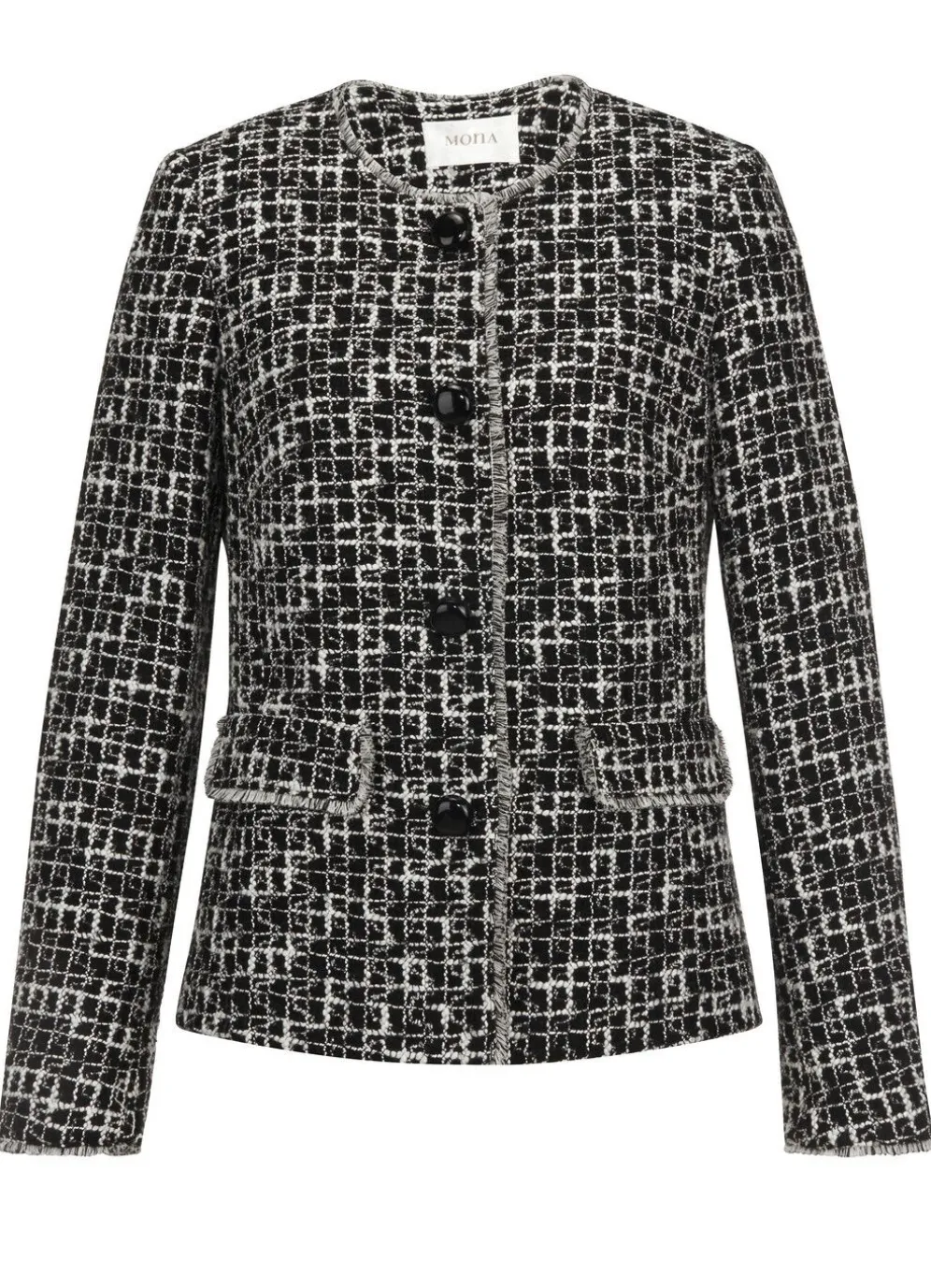 Toll – mehr bleibt bei diesem Blazer in „Chanel-Optik“ mit rundem Halsausschnitt, Knopfleiste, Zierpatten, frechen Fransen sowie einer Innentasche nicht zu sagen! Länge ca. 60 cm.