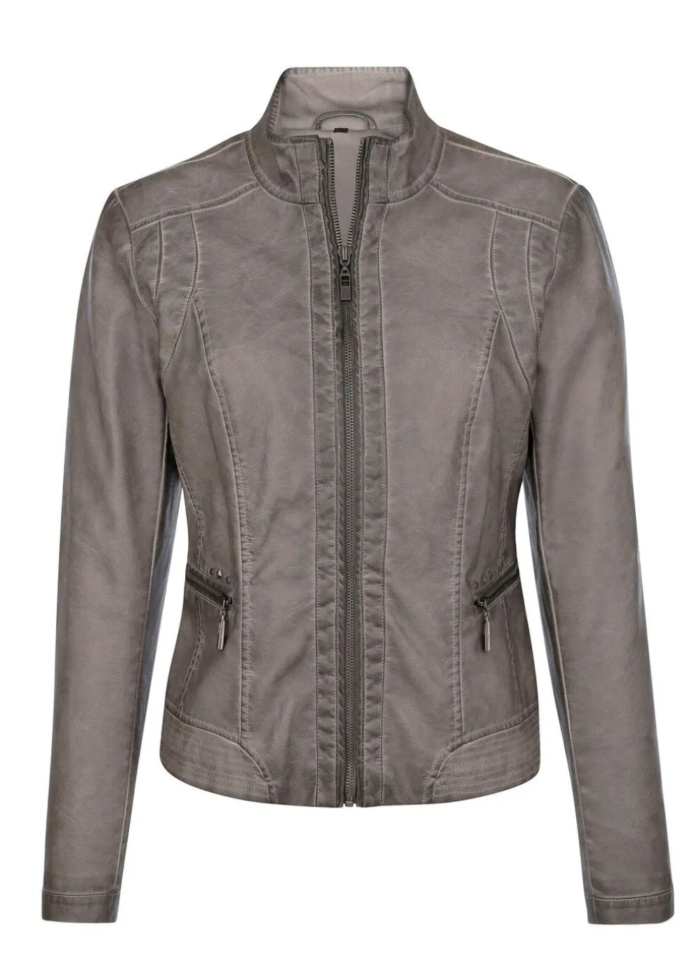 Ganz lässig zeigt sich dieser Lederimitatblazer: durch Reißverschluss hoch schließbarer Stehkragen, Reiß – verschluss an den Taschen und Ärmelabschlüssen sowie dezente Nietenzier. Länge ca. 58 cm.