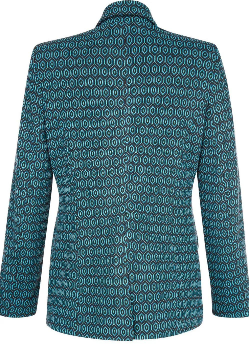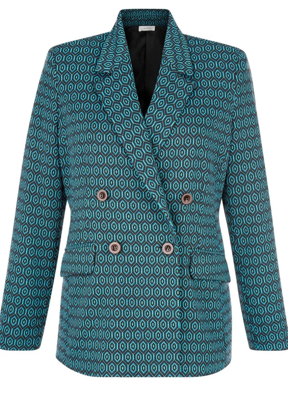 Bezaubernder, doppelreihig geknöpfter Blazer mit interessantem Dessin, Reverskragen, Pattentaschen und eingewebtem Glanzgarn veredelt. Länge ca. 71 cm.