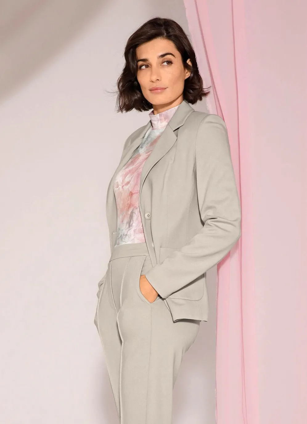 Attraktiver, leicht taillierter Blazer mit Reverskragen, Knopfleiste sowie aufgesetzten Taschen. Länge ca. 64 cm. Hergestellt aus pflegeleichtem Material und Viskose.