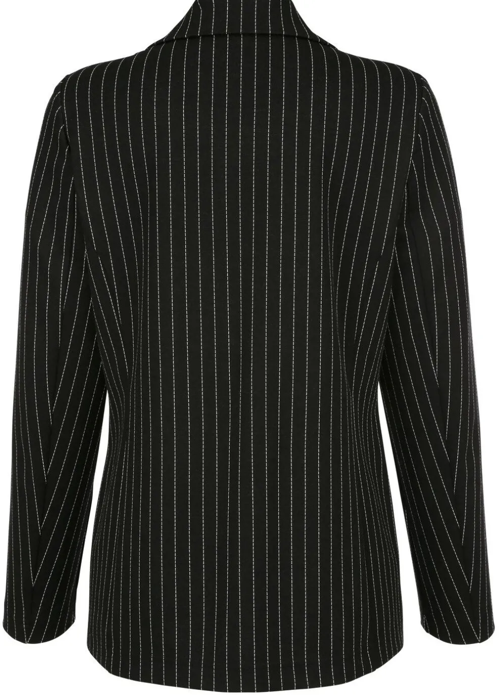 Schwarzer Jerseyblazer mit schönem Streifendessin in Weiß, Reverskragen, Knopfverschluss und Paspeltaschen. Länge ca. 65 cm.
