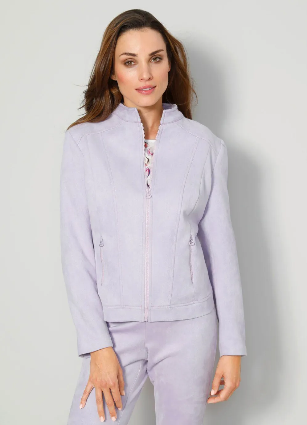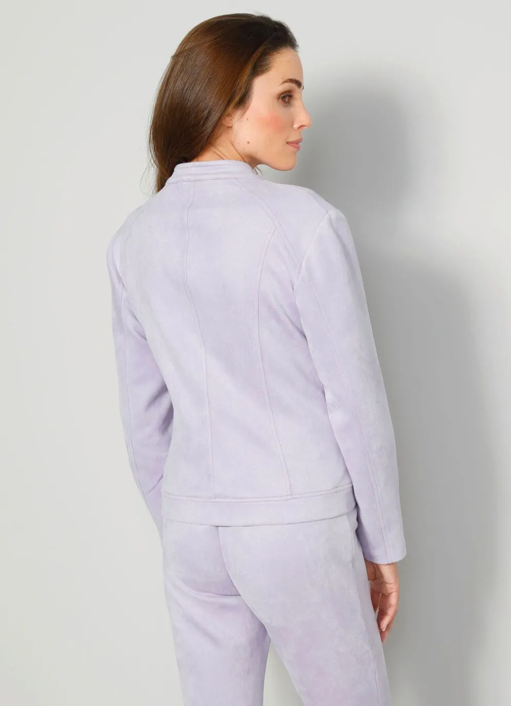 Leicht, taillierter, fliederfarbener Blazer in modischer offenkantiger Verarbeitung mit Stehkragen und langen geschlitzten Ärmeln. Länge ca. 58 cm.
