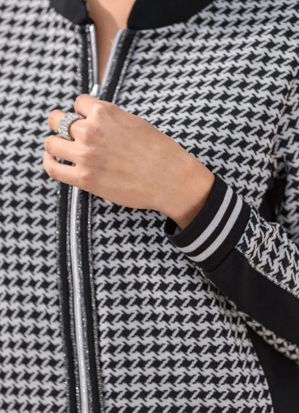 Blusenjacke mit hübschem Hahnentritt-Dessinin Schwarz-Silber, schwarzem Stehkragen, schwarz-silberfarbener Borte entlang des 2-Wege-Reißverschlusses, zwei seitlichen Eingriffstaschen mit Reißverschluss sowie schwarzem Einsatz mit silberfarbenem Zierstepp an den langen Ärmeln mit Rippenbündchen.