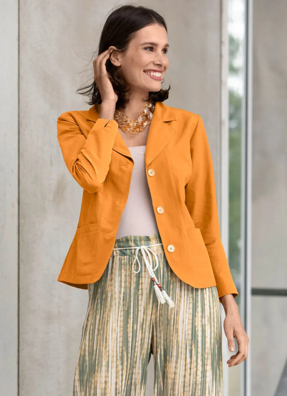 Topmodische Blusenjacke mit Schulterpolstern, Wiener Nähten im Vorder- und Rückteil, Reverskragen, Knopfleiste, langen Ärmeln sowie zwei Taschen.
