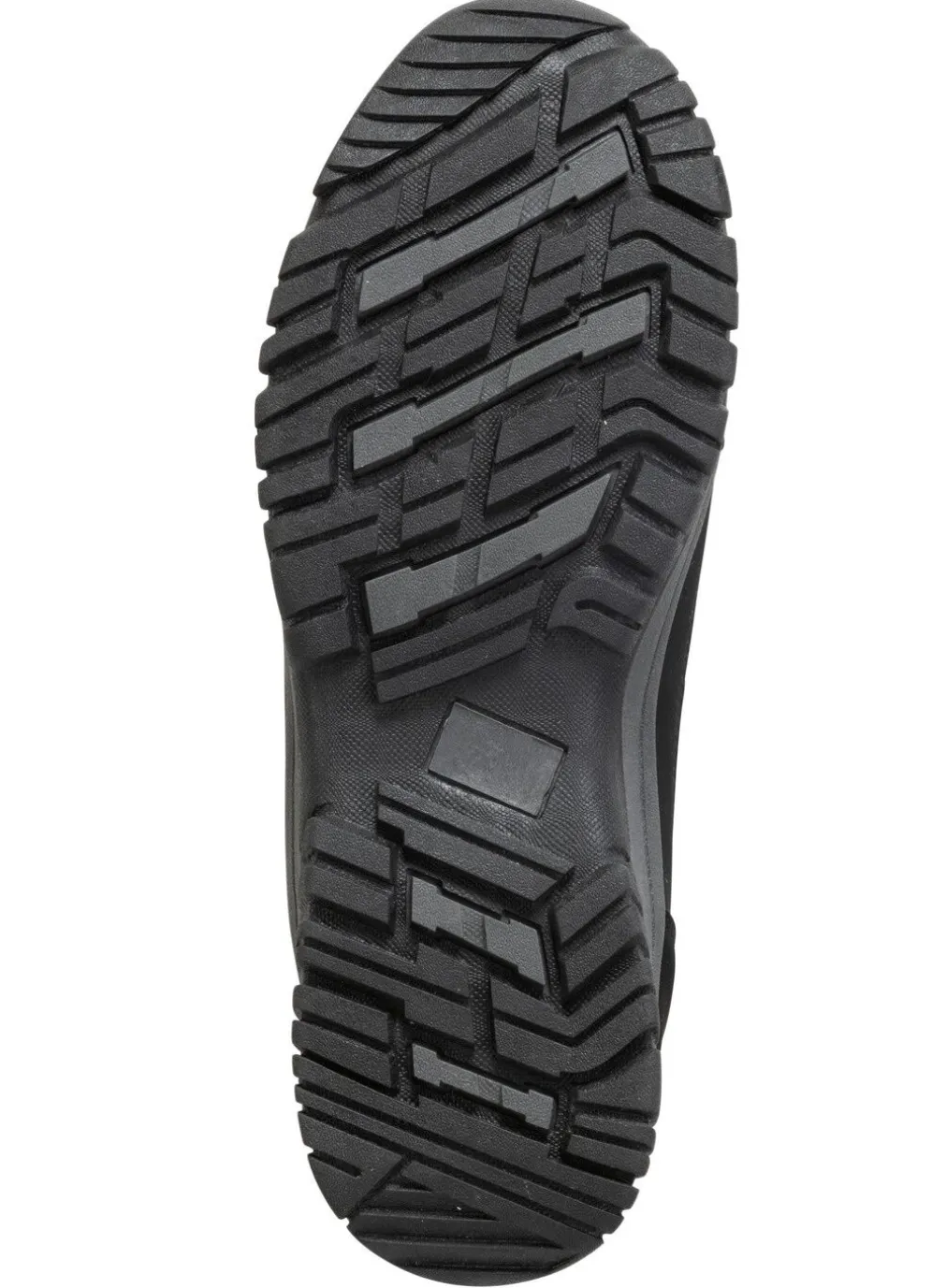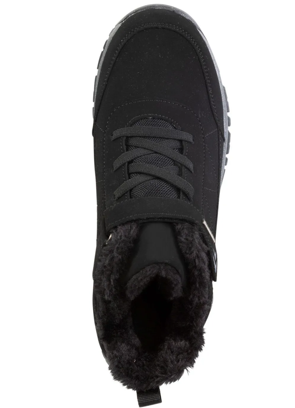 Schwarzer Bootie aus Nubuksynthetik, mit Klettspange und elastischer Zier-Schnürung: mit Klimamembrane ausgestattet, Warmfutter und herausnehmbare Decksohle aus 100% Polyester, leichte TPR-Profilsohle und 20 mm Keilabsatz. Schafthöhe ca. 9 cm