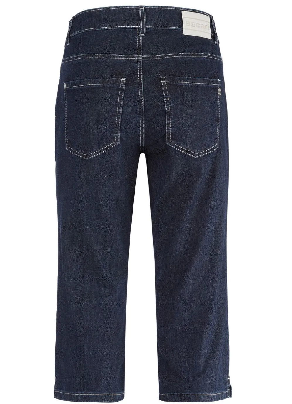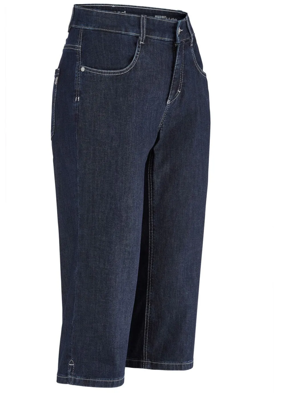 Topaktuelle Capri-Jeans in 4-Pocket-Form: elastischer Formbund, Gürtelschlaufen, Knopf- und Reißverschluss, Jeanssattel sowie seitliche Schlitze an den Beinabschlüssen. Innenbeinlänge ca. 46 cm, Fußweite ab 42 cm.