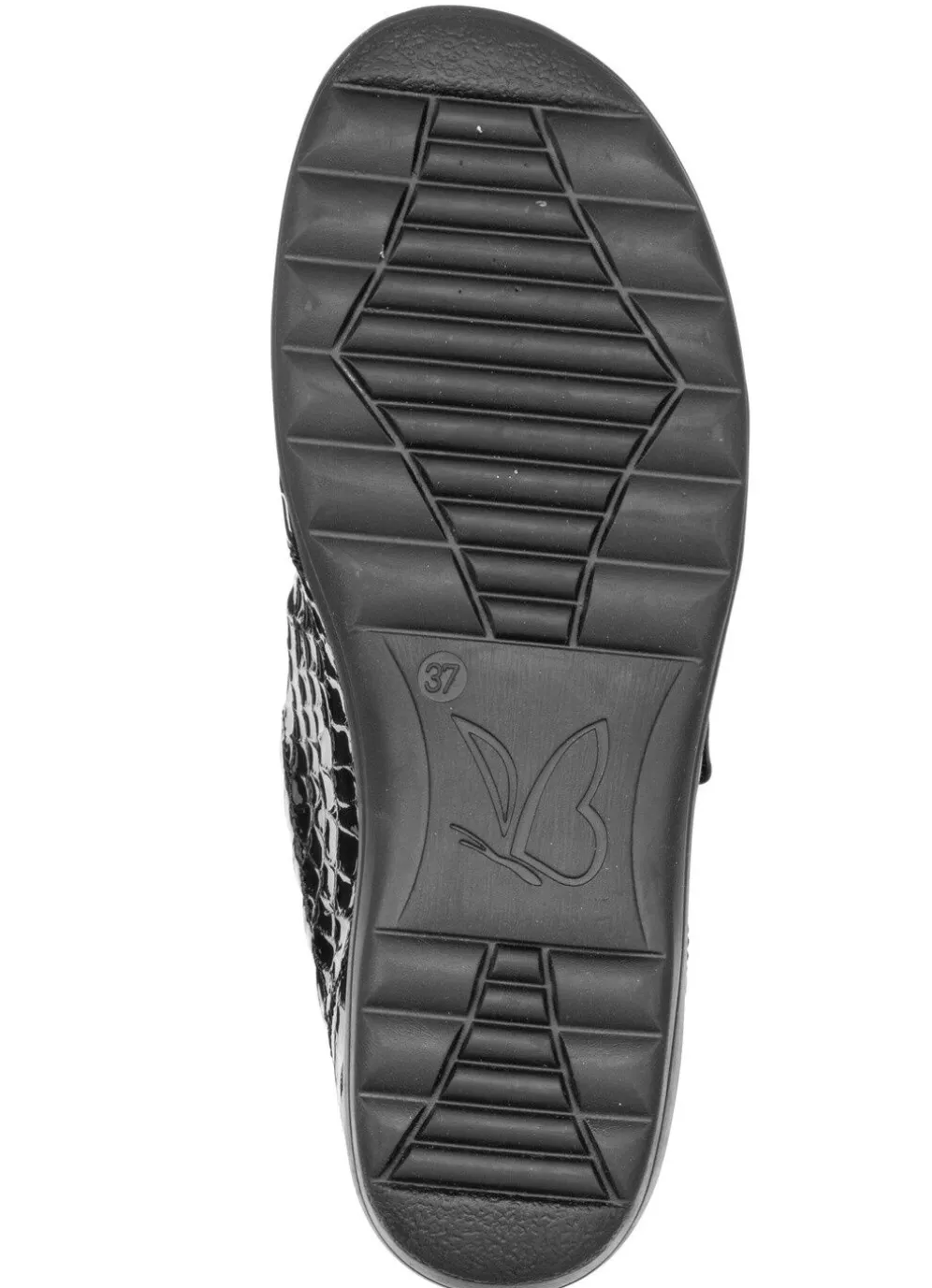 Edle Slipper aus krokogeprägtem Lackleder, mit praktischer Klettspange: Weite H, Textilfutter, herausnehmbares Lederfußbett, leichte TR-Profilsohle sowie 20 mm Keilabsatz