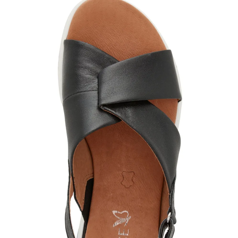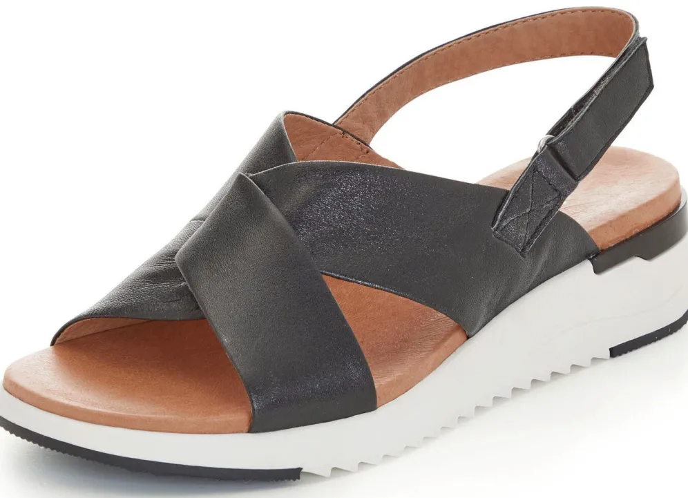Sandale aus Nappaleder: Weite G, verstellbare Fersenklettspange, seitlicher Gummizug, Futter, gepolsterte Lederdecksohle, leichte TPR-Profilsohle sowie 30 mm Keilabsatz