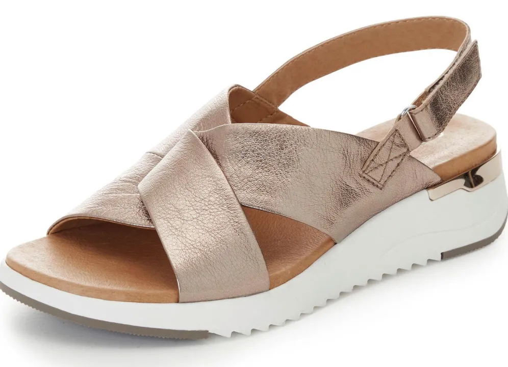 Sandale aus Nappaleder: Weite G, verstellbare Fersenklettspange, seitlicher Gummizug, Futter, gepolsterte Lederdecksohle, leichte TPR-Profilsohle sowie 30 mm Keilabsatz