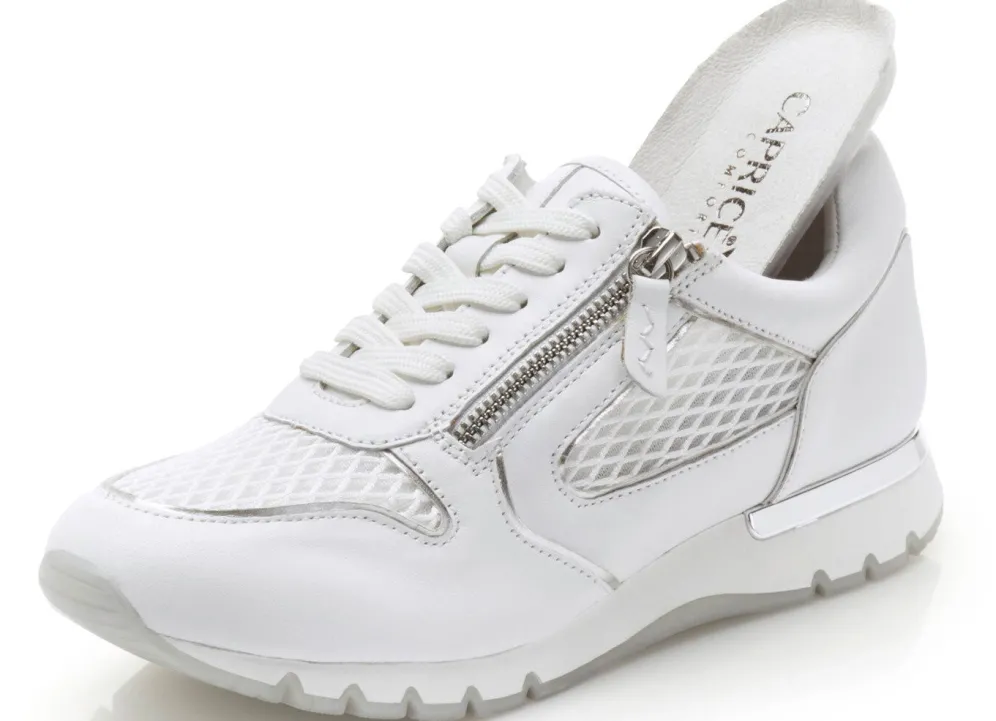 Sneaker aus luftigem Textilmaterial und zart glänzendem Veloursleder, in Weiß mit Nappaleder kombiniert: in Weite H, mit silberfarbenen Einsätzen, Schnürung und seitlichem Reißverschluss, Futter, herausnehmbarem Lederfußbett, leichter TPR-Profilsohle sowie 15 mm Keilabsatz