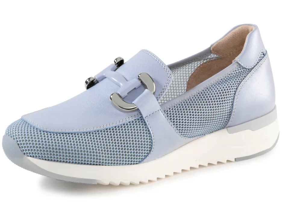 Sommerlicher Slipper aus luftigem Textilmaterial und weichem Nappaleder: Weite G, Elastik-Abschluss, Zierspange, teilweise mit Textilfutter, herausnehmbares Lederfußbett, leichte TR-Profilsohle sowie 20 mm Keilabsatz