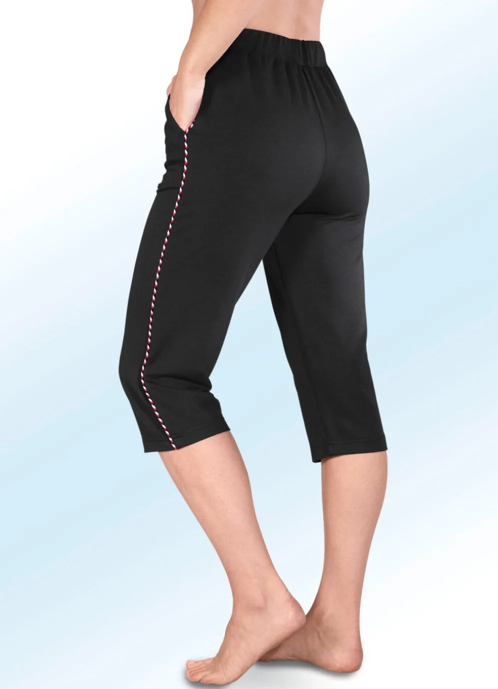 Tragangenehme Caprihose von Plantier in gerader Form, mit bequemem Dehnbund rundum, zwei Seitennahttaschen und Tunnelzugband sowie farblich gedrehter Kordel an der Seitennaht.