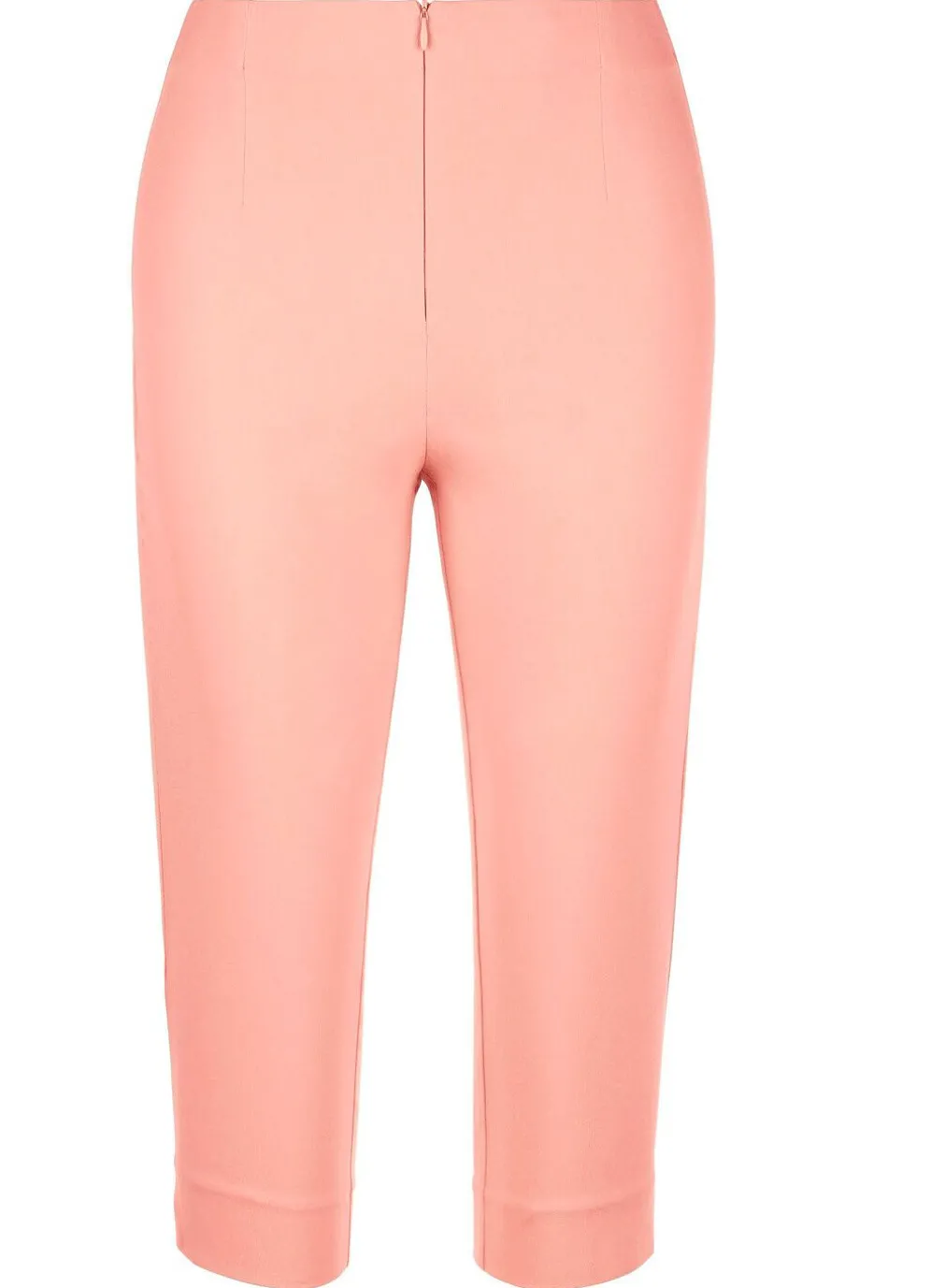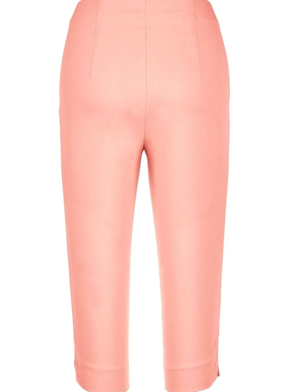 Flotte Caprihose mit angenehmem, komfortablem Dehnbund rundum, Knopf- und Nahtreißverschluss, figurformende Abnäher im Vorder- und Rückteil sowie seitliche Schlitze an den Beinabschlüssen. Innenbeinlänge 54 cm.