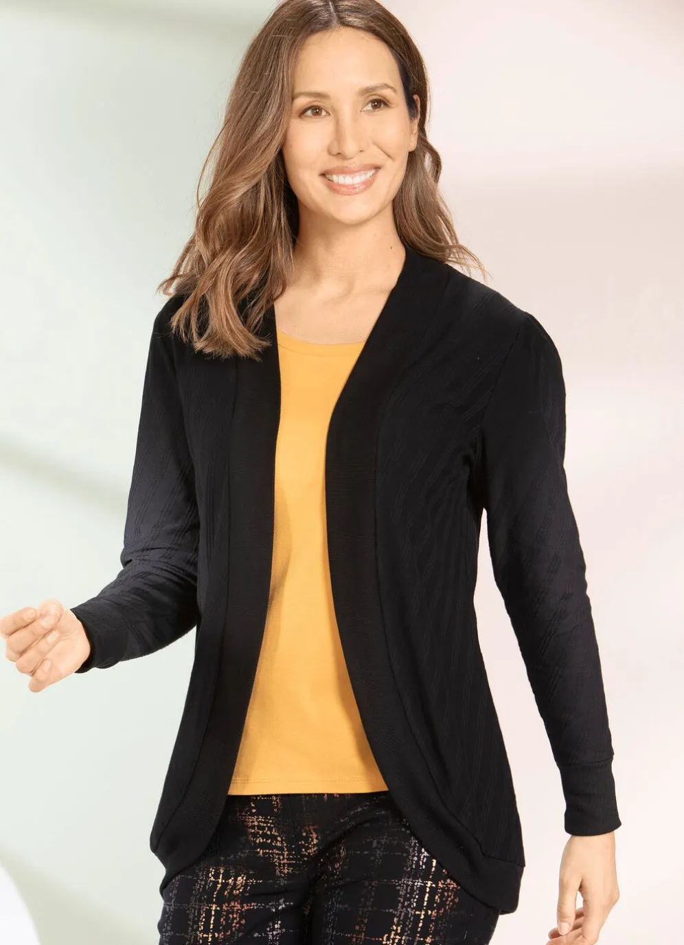 Einfach toll zu kombinieren ist dieses verschlusslose, schwarze Chasuble mit Rippen-Jersey an der Leiste und an den Abschlüssen der langen Ärmeln sowie am Saumabschluss.