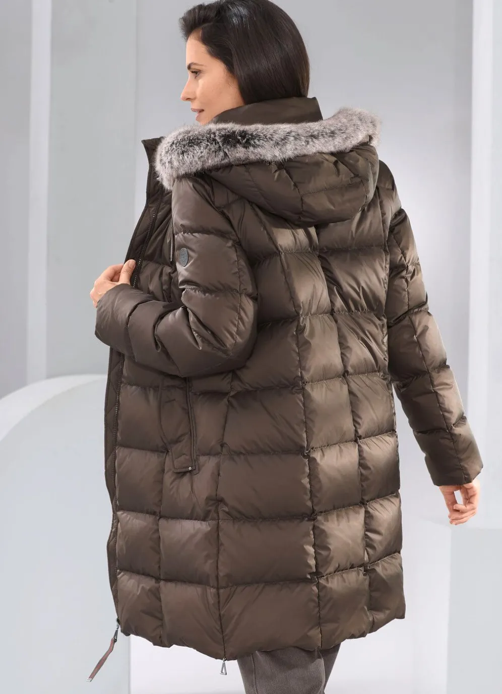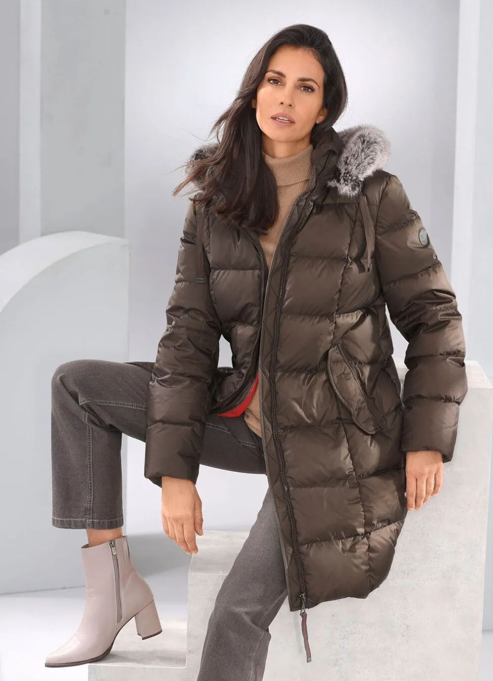 Daunen-Kurzmantel: durch Reiß?verschluss hoch schließbarer Stehkragen, Schubtaschen mit Patte und verdeckten Druckern, umschlagbare Ärmel sowie eine Innentasche. Länge ca. 90 cm, ab Gr. 40 ca. 92 cm, ab Gr. 46 ca. 94 cm, bei Gr. 52 ca. 96 cm.