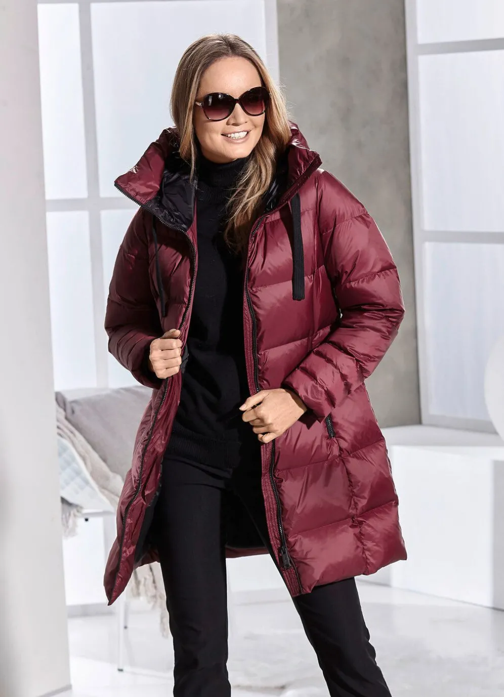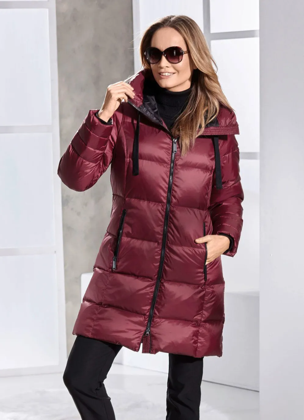 Kuscheliger Daunen-Kurzmantel: feste Kapuze mit Bindeband und umschlagbarem Rand, durch 2-Wege-Reißverschluss hoch schließbarer Stehkragen, Reißverschlusstaschen, Windfangärmel aus Rippenstrick sowie eine Innentasche. Länge ca. 90 cm.
