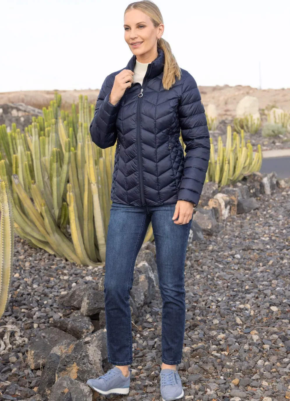 Jacke mit verschiedenen Steppvarianten: durch Reißverschluss hoch schließbarer Stehkragen, sowie nahtfeine Reißverschlusstaschen. Länge ca. 65 cm, ab Gr. 42 ca. 68 cm, ab Gr. 48 ca. 71 cm.