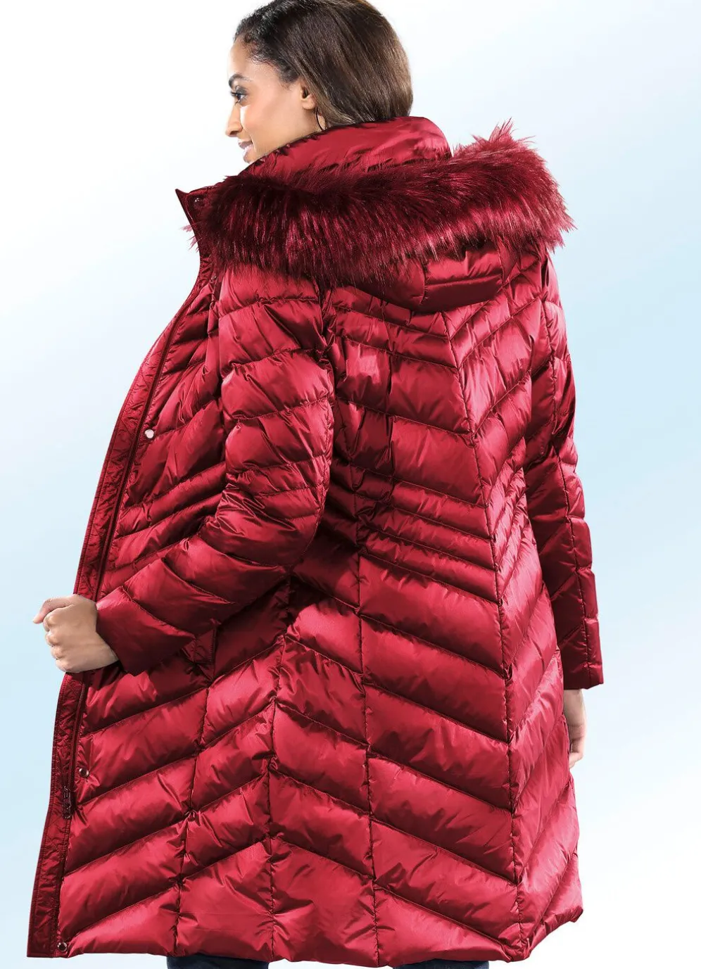 Kuschelig warm begleitet Sie dieser Daunenmantel durch den Winter: abnehmbare Kapuze mit abnehmbarem Kunstpelz-Besatz, durch 2-Wege-Reißverschluss unter der Druckerleiste hoch schließbarer Steh-Umlegekragen, Taschen mit Blende und Drucker, Windfang an den Ärmeln sowie eine Innentasche. Länge ca. 100 cm.