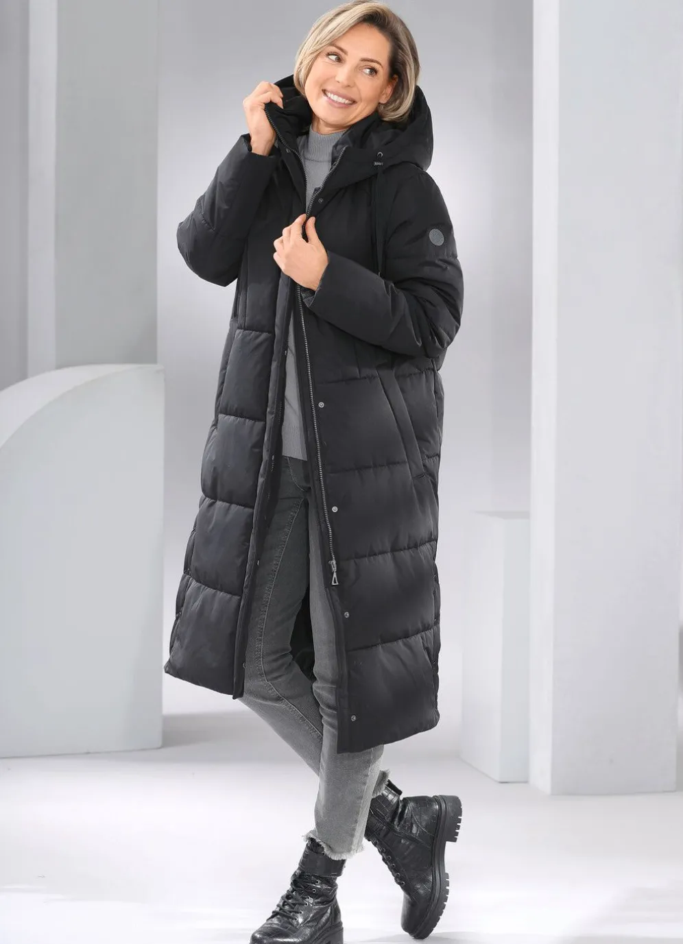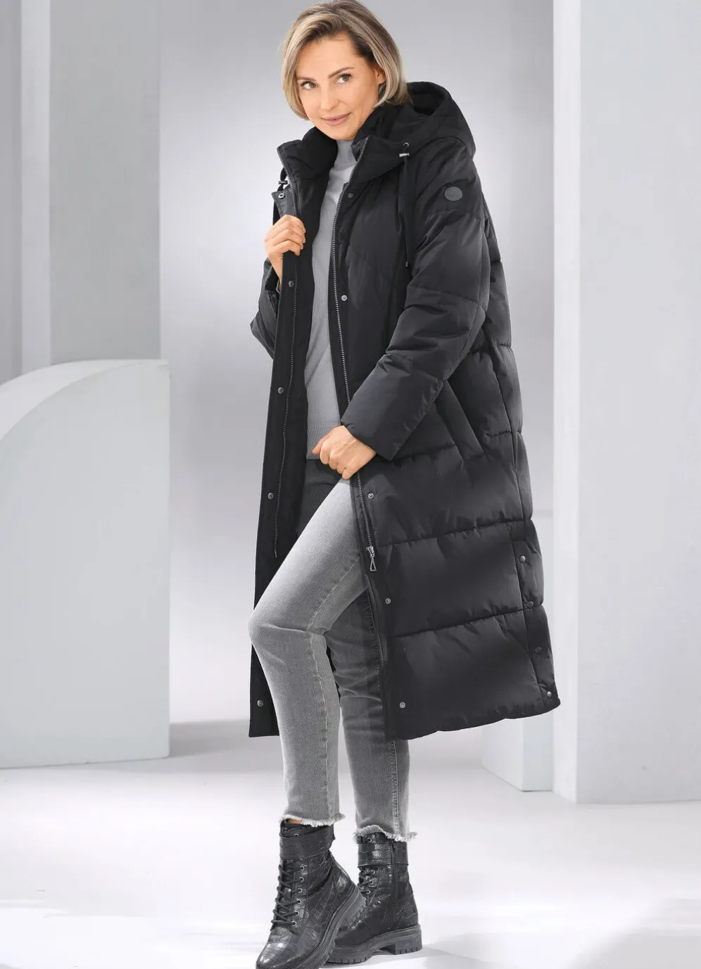 Daunenmantel: durch Reißverschluss unter verdeckter Druckerleiste hoch schließbarer Stehkragen, verdeckte Reißverschlusstaschen, Seitenschlitze mit Druckern, umschlagbare Ärmel sowie eine Innentasche. Länge ca. 110 cm.