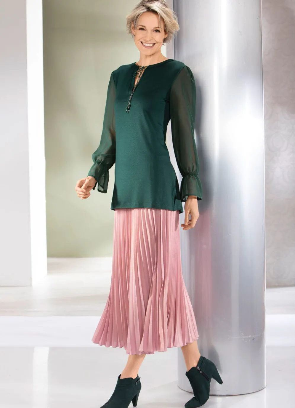 Die aufwendigen rundum gearbeiteten Sonnenplissee-Falten verleihen diesem wunderschönem, roséfarbenem, dezent schimmerndem Rock seine elegant schwingende Silhouette. In bequem zu tragender Schlupfform, mit Dehnbund rundum sowie gekänteltem Saumabschluss. Länge ab Taille ca. 78 cm, bei K-Gr. ca. 74 cm.