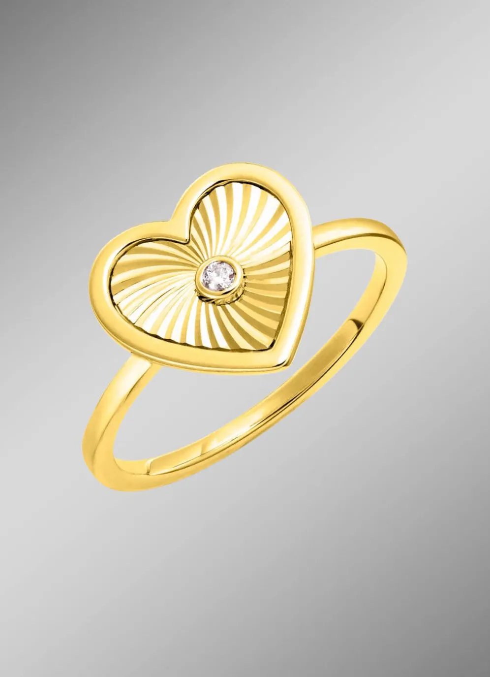 Ein Herz, das für Stil und Gefühl schlägt – dieser Damenring aus feinem 375/- Gold vereint romantisches Design mit edler Ausstrahlung. Der herzförmige Ringkopf misst 11 x 12 mm und ist kunstvoll diamantiert, wodurch ein faszinierendes Spiel aus Licht und Struktur entsteht. Im Zentrum funkelt ein weißer Brillant mit der Reinheit Piqué 2 – ein echter Blickfang, der dem Ring eine besondere Tiefe und Eleganz verleiht.