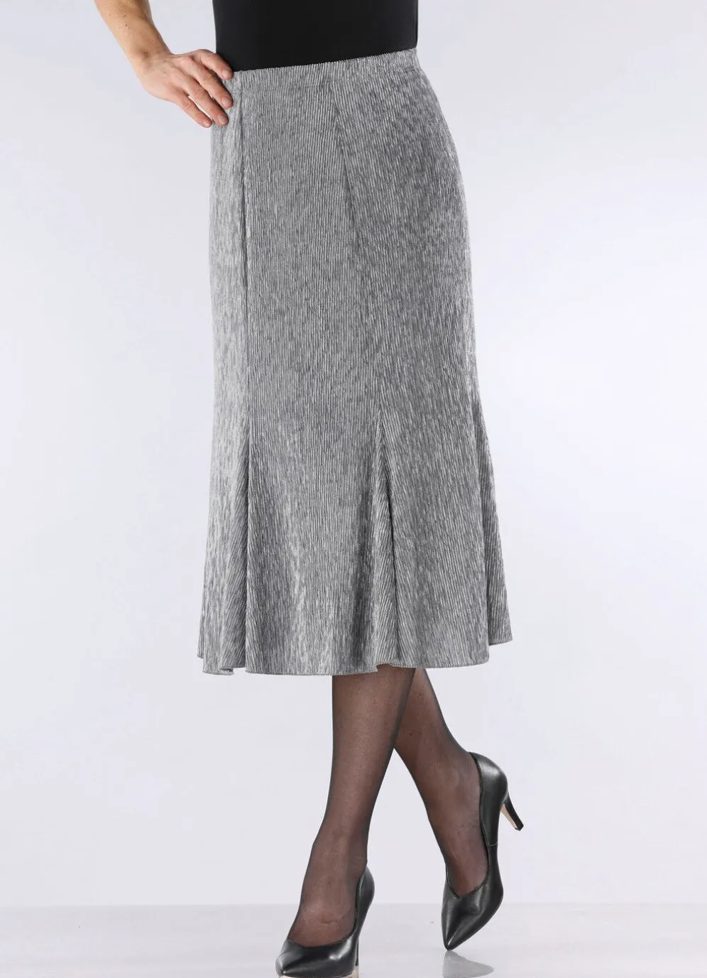 Edel schimmernder, figurumschmeichelnder 6-Bahnenrock in bequemer Schlupfform, mit Dehnbund rundum sowie nach unten hin glockig schwingendem Saum durch die modische Godet-Form. Länge ab Taille ca. 74 cm, bei K-Gr. ca. 70 cm.