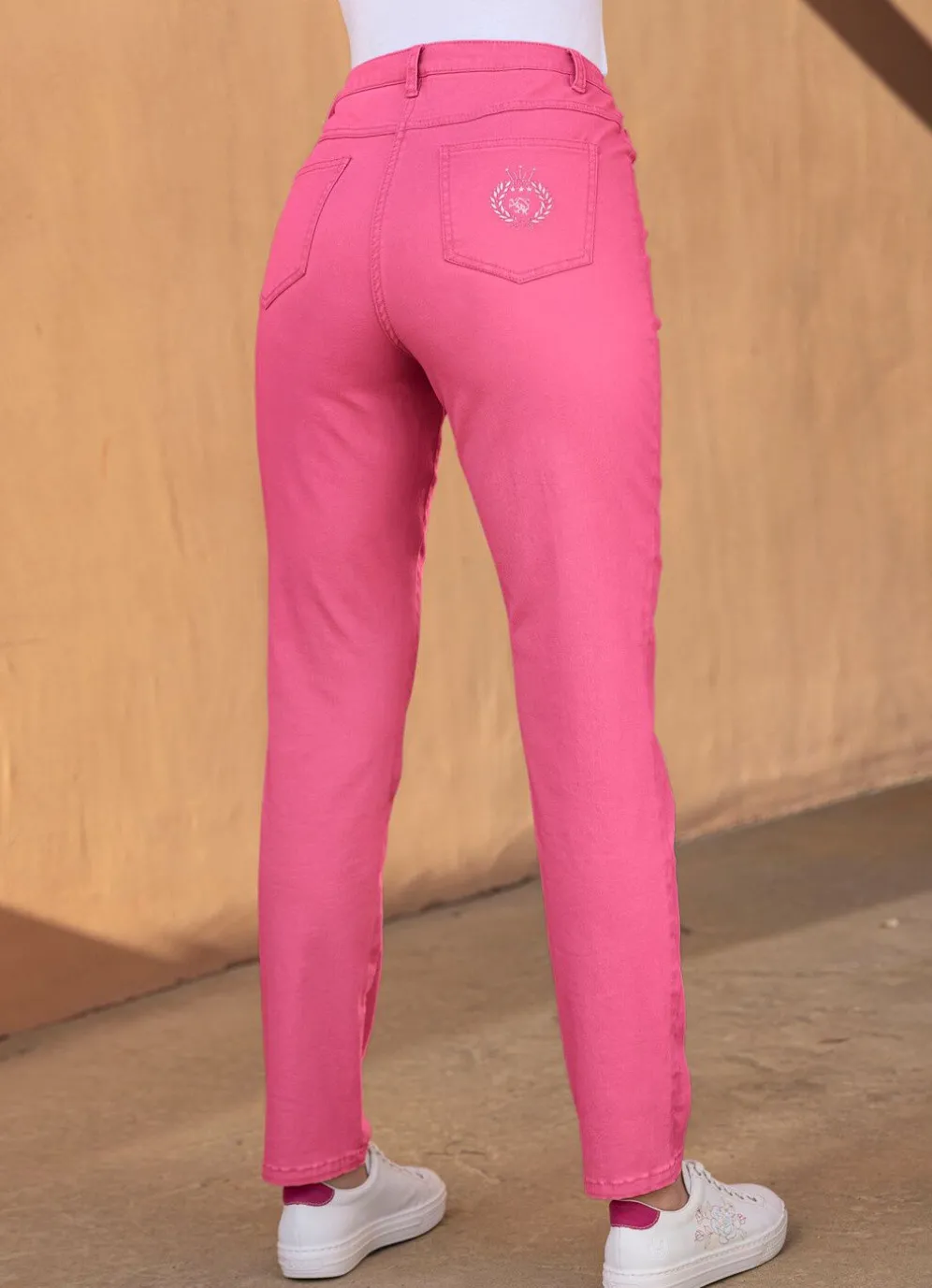 Ihr Modell PAOLA – für absolutes Wohlbefinden sorgt diese ansprechende Edeljeans in 5-Pocket-Form: elastischer Formbund, Gürtelschlaufen, Knopf- und Reißverschluss sowie schöne, kontrastfarbene Stickerei, verziert mit Strasssteinen auf einer der aufgesetzten Gesäßtaschen, Jeanssattel sowie dezente Auswascheffekte. Innenbeinlänge ca. 78 cm, Fußweite ab 31 cm.