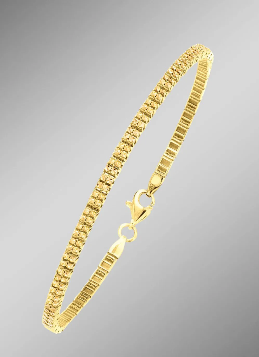 aus feinem 375/- Gold setzt mit seiner fantasievollen Gliederung und strukturierten Oberfläche ein glänzendes Statement. Das Design verbindet klassische Eleganz mit moderner Raffinesse – ideal für stilbewusste Träger*innen, die subtilen Luxus schätzen. Der sichere Karabinerverschluss sorgt für angenehmen Tragekomfort und die Länge von 19 cm passt perfekt ans Handgelenk, ohne Kompromisse bei Stil oder Bequemlichkeit.