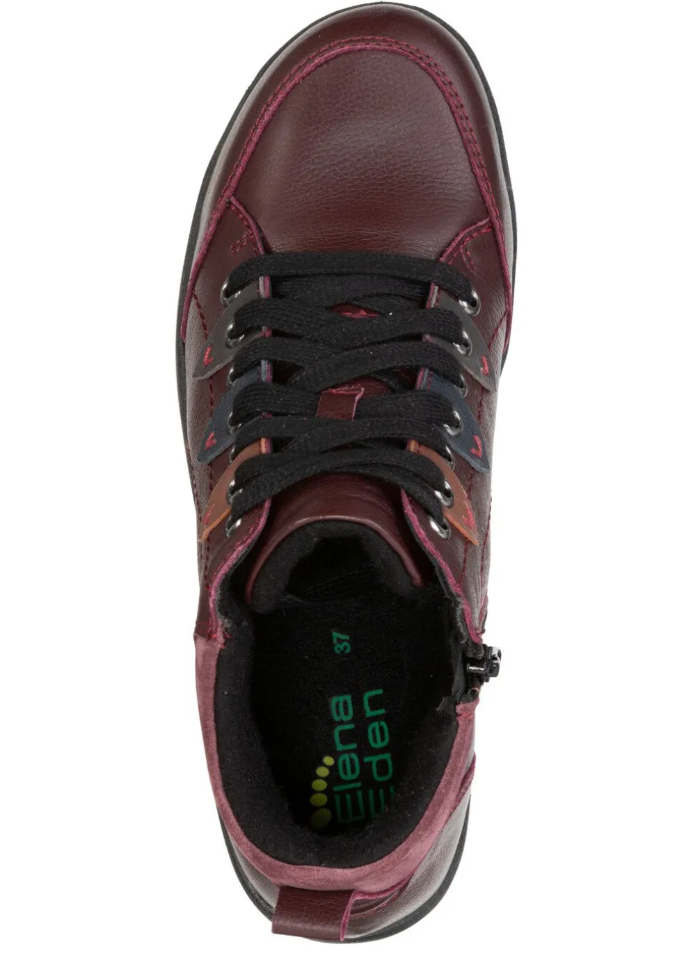 Boots von ELENA EDEN, aus genarbtem Nappaleder mit gepolstertem Schaftrand aus Veloursleder: Weite H, Schnürung, praktischer Innenreißverschluss, Futter und herausnehmbares Fußbett aus Fleece, leichte TR-Profilsohle sowie 20 mm Keilabsatz. Schafthöhe ca. 8 cm