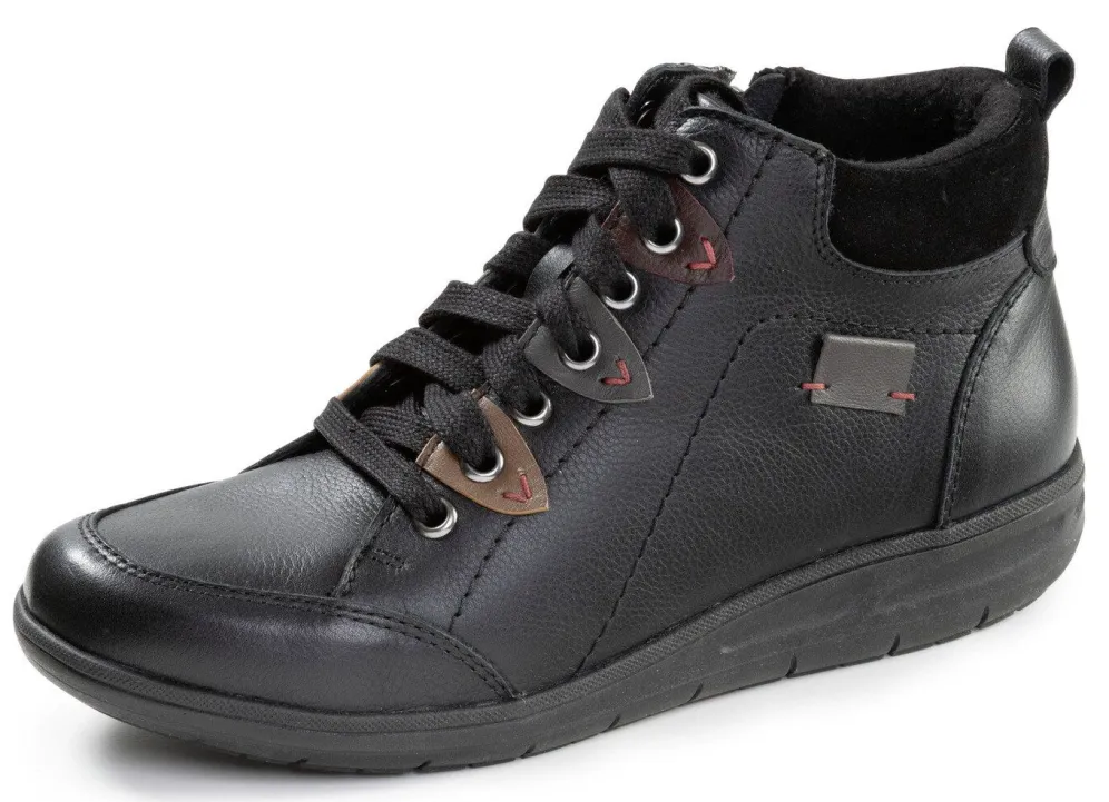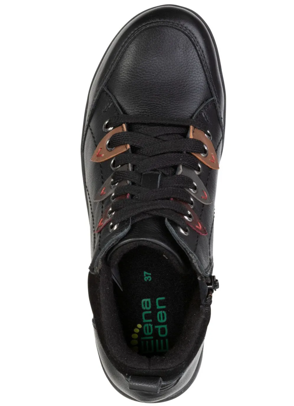 Boots von ELENA EDEN, aus genarbtem Nappaleder mit gepolstertem Schaftrand aus Veloursleder: Weite H, Schnürung, praktischer Innenreißverschluss, Futter und herausnehmbares Fußbett aus Fleece, leichte TR-Profilsohle sowie 20 mm Keilabsatz. Schafthöhe ca. 8 cm