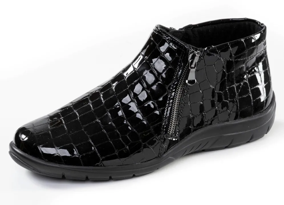 Schwarze Boots von ELENA EDEN, aus krokogeprägtem Lackleder, mit zwei seitlichen Reißverschlüssen: Weite H, Futter, herausnehmbares Fußbett, leichte PU-Luftpolster-Profilsohle sowie 20 mm Keilabsatz. Schafthöhe ca. 8 cm