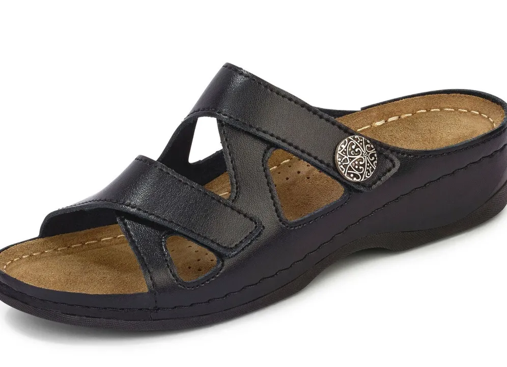 Pantoletten von ELENA EDEN, aus Rind-Nappaleder: in Weite G, zwei verstellbare Klettspangen, gepolstertes Lederfußbett mit Pelotte und Gelenkstütze, leichte PU-Riffelsohle und 30 mm Keilabsatz