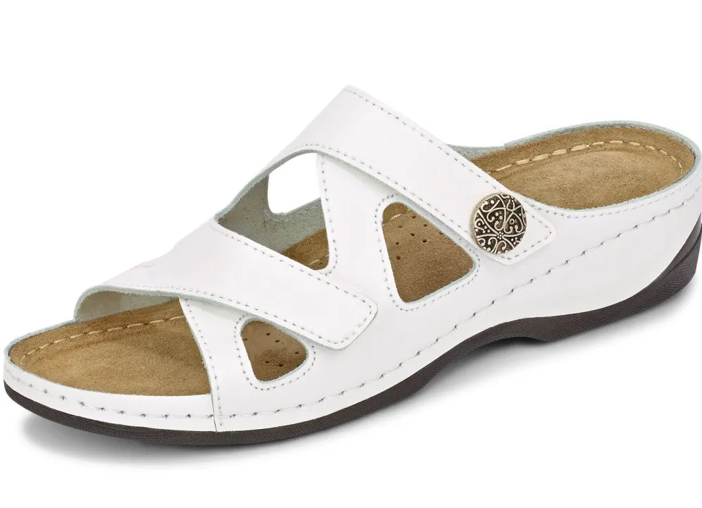 Pantoletten von ELENA EDEN, aus Rind-Nappaleder: in Weite G, zwei verstellbare Klettspangen, gepolstertes Lederfußbett mit Pelotte und Gelenkstütze, leichte PU-Riffelsohle und 30 mm Keilabsatz